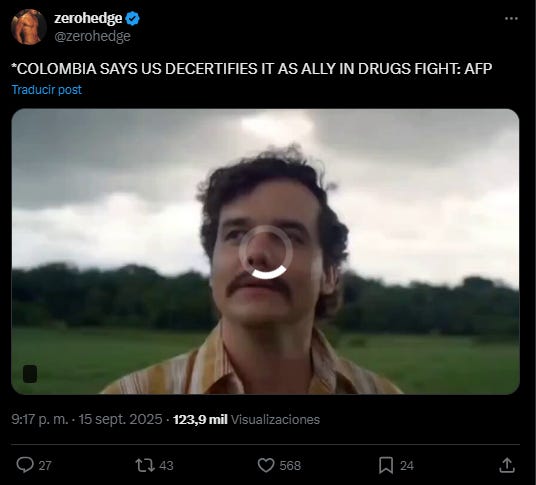 Trump “reprueba” a Colombia en la lucha antidrogas, pero no corta los dólares que manda. Petro, por su parte, responde diciendo que el problema es la adicción estadounidense, suspende compras de armas y señala al expresidente Iván Duque. Resumen en un poema: ni se corta la coca / ni se corta la plata / pero ambos gobiernos / suman puntos en su banca.