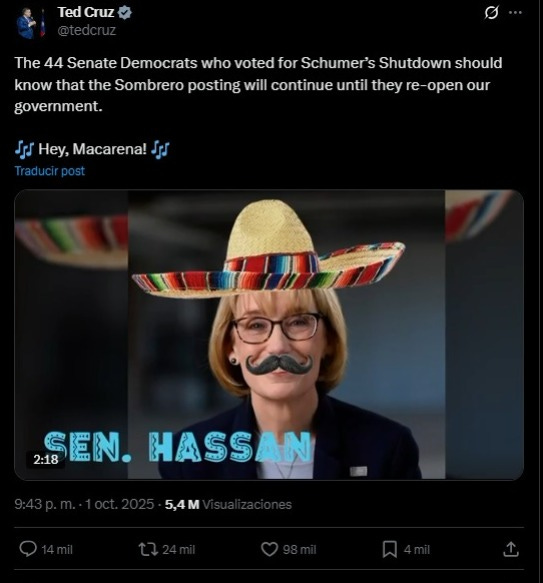 Los sombreros de mariachi no aparecen por casualidad. Son parte de una estrategia para vincular a los demócratas con la inmigración indocumentada y, de paso, sembrar la idea de que defender a esa comunidad es casi un acto antiamericano. Es una táctica vieja, solo que ahora con IA y amplificada por Trump, Ted Cruz y compañía, que saben que el “humor” llega más lejos que un discurso.