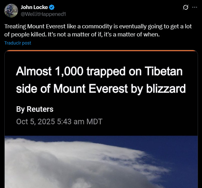 Una tormenta de nieve en el Everest dejó a cientos de turistas atrapados en la ladera china durante el feriado nacional. Los equipos de rescate trabajan para evacuar a los excursionistas, mientras las autoridades cierran la zona escénica por tiempo indefinido. Como si fuera consuelo, el gobierno dice que todos cuentan con alimentos y abrigo suficientes.