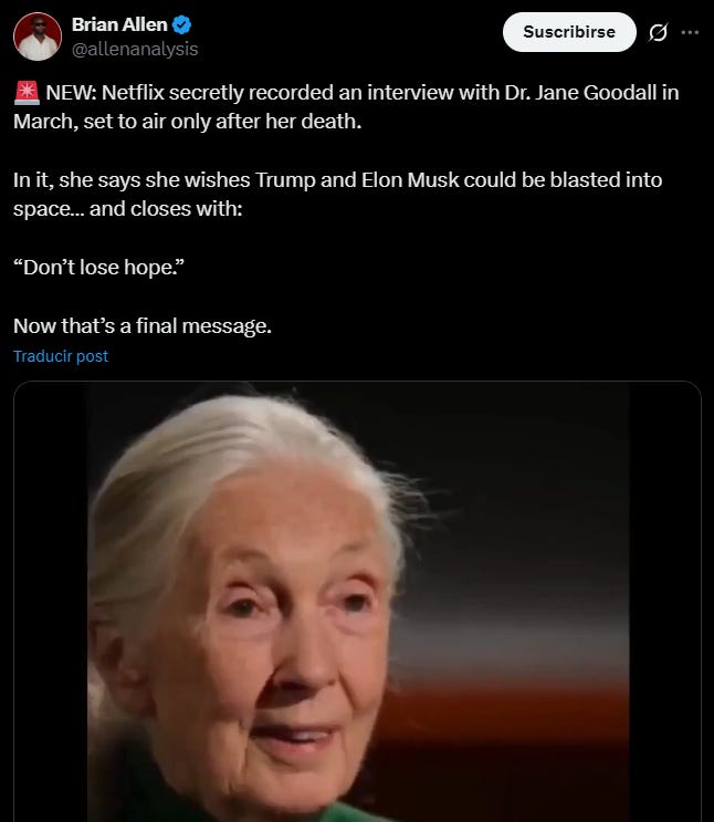 Jane Goodall dejó testamento y tripulación: Musk piloteando, Trump de copiloto y Putin, Xi y Netanyahu como equipaje emocional rumbo al espacio. Su idea: estudiar la agresividad de los alfa en un safari interplanetario. Si todo sale bien, podría ser el primer hábitat marciano sin conferencias de prensa ni tweets.