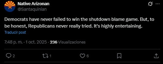 Y como ya sabes, el gobierno federal bajó la persiana. What now? Muchas cosas y si te perdiste nuestra edición anterior, te la dejo aquí para que leas cómo afecta el shutdown. Hoy solamente te cuento cuáles son las opciones para ponerle fin al cierre. ¿La mala noticia? Dos de esos caminos dependen de los demócratas… Mientras tanto, el gobierno apaga al watchdog de los watchdogs y promete que todo es por el bien de los contribuyentes. Ahora, con la luz cortada en el Capitolio, la oscuridad en los pasillos del poder será mucho más fácil de administrar.