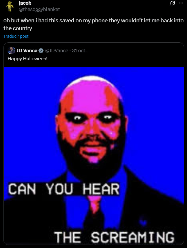 No, no se nos iba a olvidar: JD Vance decidió disfrazarse de su propio meme y, para sorpresa de nadie, fue viral. Cuenta la leyenda que eso es motivo para negar la entrada al país a turistas, pero en la Casa Blanca no aplica eso. De todas maneras, ni el ICE ni CBP saben nada al respecto.