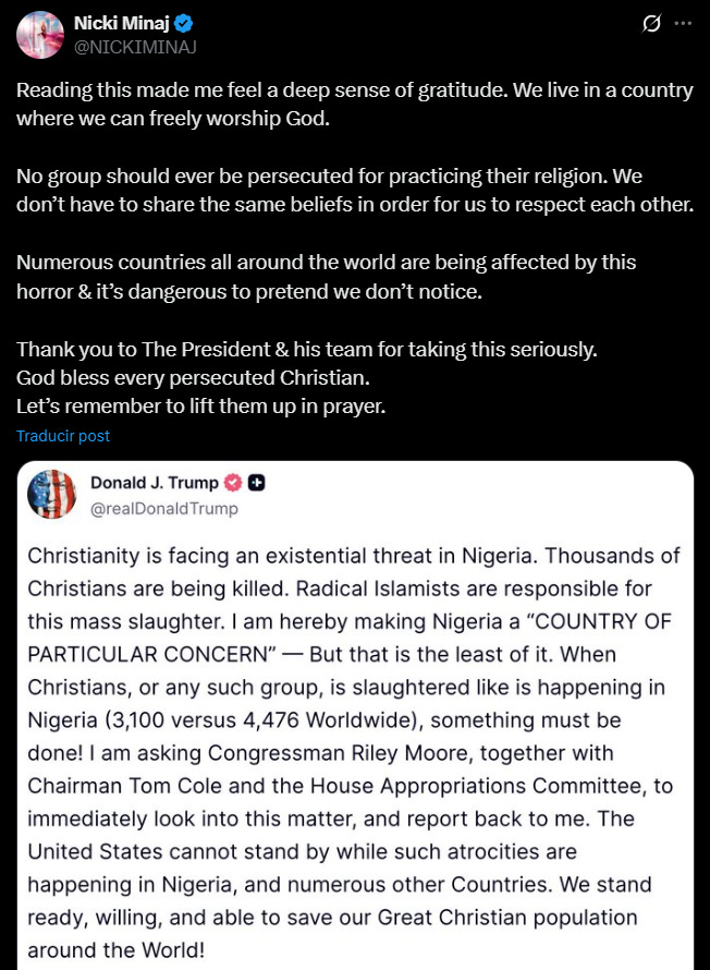 El presidente Trump advirtió que podría enviar tropas a Nigeria si el gobierno no detiene la violencia contra cristianos. Si bien es real, los expertos dicen que los ataques en Nigeria afectan por igual a musulmanes y cristianos, y que hablar de genocidio religioso distorsiona la realidad del conflicto. No solo es inexacto, sino potencialmente peligroso: alimenta tensiones religiosas y podría desestabilizar aún más una región ya frágil.