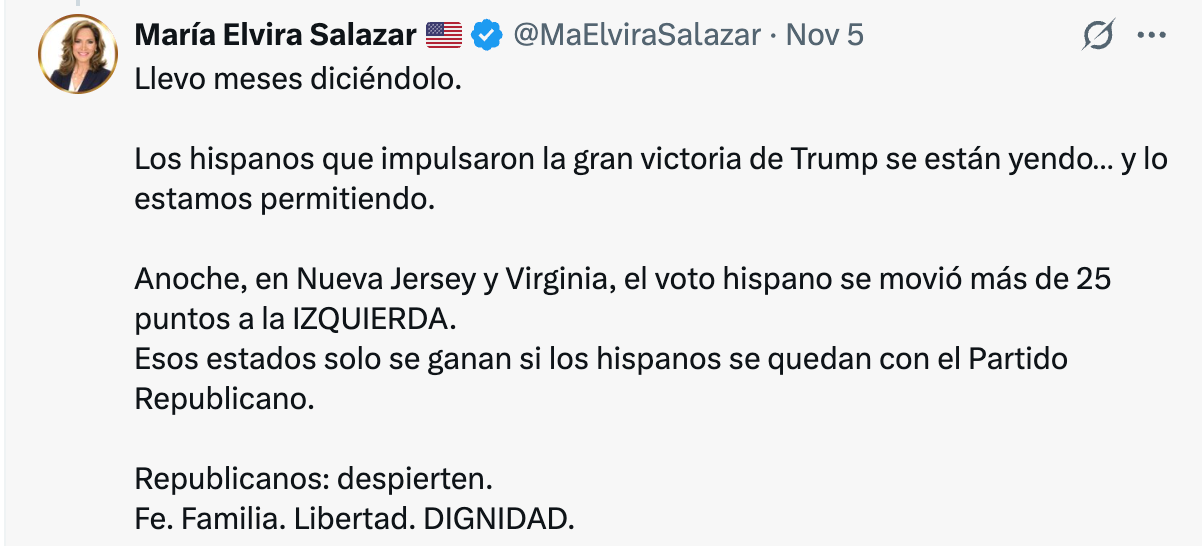 Los resultados de las elecciones del martes 4 fueron el primer termómetro real de la aprobación de la administración y del Partido Republicano desde las elecciones generales, y el resultado es alarmante para ellos. Abigail Spanberger ganó Virginia por 14 puntos; Trump la había perdido por apenas 5.7. Mikie Sherrill tomó Nueva Jersey por 13; Trump perdió ahí por 5.9. En Passaic County, condado que es mitad latino y donde Trump había ganado por primera vez para un republicano desde 1992, Sherrill arrasó por 15 puntos. Los demócratas capturaron dos tercios del voto latino en Nueva Jersey. Todo el trabajo republicano con los latinos desde 2020, borrado en 12 meses.