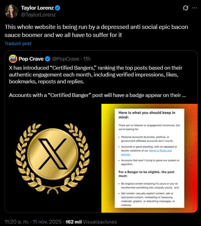 X ahora entrega “certified bangers” a los mejores posts. Básicamente, una estrellita en la frente por ser popular: nadie sabe qué mide ni para qué sirve, pero brilla. En la era Musk, todo es gamificación y ego con verificación azul.