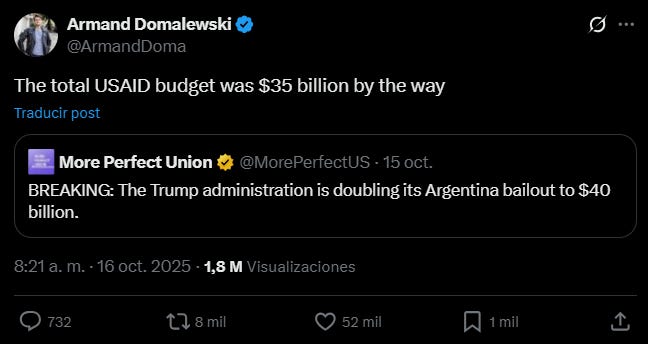 De la Casa Blanca a la Rosada solo hay un cheque de $40,000 millones de distancia. Durante la visita de Javier Milei a Washington, Trump confirmó el rescate. Here we go again: ¿y la narrativa de America First? El presidente Trump lo justificó como un apoyo a la “filosofía financiera correcta”.