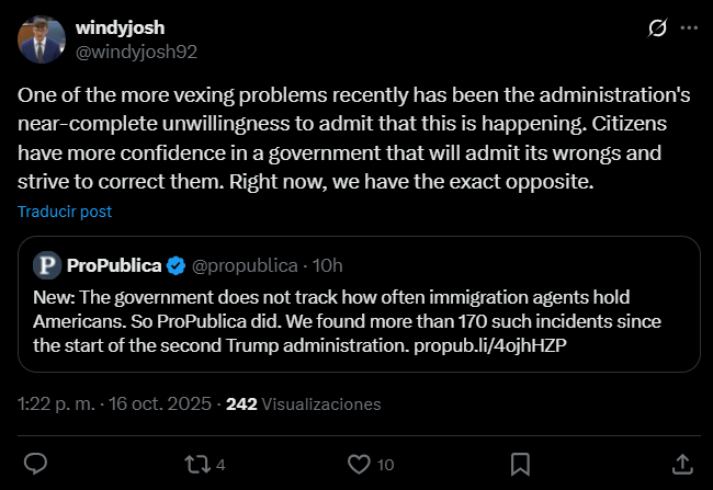 Tener pasaporte azul ya no basta. ProPublica documentó más de 170 casos de ciudadanos estadounidenses detenidos por error en redadas o protestas este año. En al menos 20 casos, las personas estuvieron incomunicadas durante más de un día. Aunque ICE justifica algunos arrestos como “interferencias”, la mayoría fueron desestimados, revelando un patrón de detenciones arbitrarias y falta de supervisión institucional. Cuatro palabras: erosión del debido proceso.