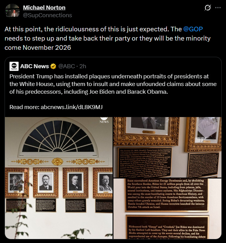 Trump convirtió la columnata en una extensión física de Truth Social. Más que homenajes históricos, las placas funcionan como comentarios fijados, diseñados para provocar y reescribir el relato presidencial desde el poder. Institucionalizan la polarización al convertir ataques partidistas en elementos permanentes del espacio presidencial. Hasta que llegue otro.