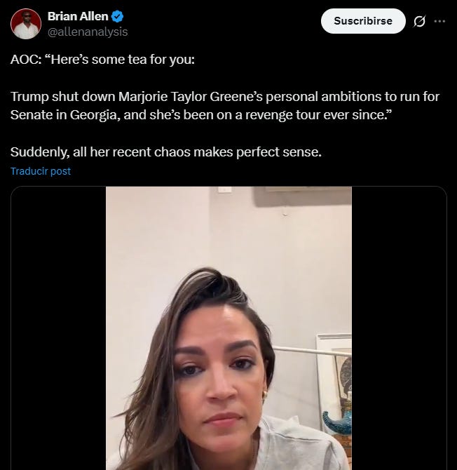 Hora de los chismes del Capitolio: Alexandria Ocasio-Cortez aseguró en un live que Trump impidió que Marjorie Taylor Greene se postulara al Senado por Georgia. Desde entonces, la congresista ha estado en una gira vengativa contra la Casa Blanca. Hay muchas cosas que no sabemos: si es verdad, quién es el villano, quién es el héroe, ni cómo sería un final feliz. Por lo pronto, MTG igual sabe que quiere lanzarse, pero a la presidencia en 2028.