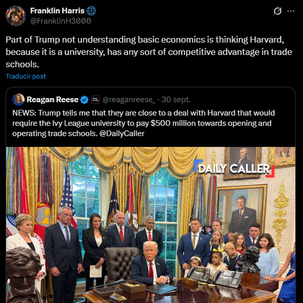 Trump anunció que Harvard aceptó pagar $500 millones y abrir trade schools, enseñar AI y “muchas otras cosas”. Llama al 0-800-TRUMP y entonces la restauración de fondos federales será un hecho. Esta es la nueva cátedra de “Cómo negociar con tu país” en la facultad de Economía.