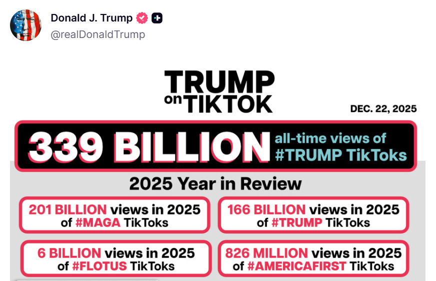 De todas formas, gobernar el mundo y presumir una que otra métrica no son excluyentes: para Trump, son parte del mismo job. El presidente celebró en Truth Social haber alcanzado 339,000 millones de views históricas en TikTok, citando cifras gigantescas asociadas a MAGA, America First y hasta a la FLOTUS. El mensaje no es solo vanidad digital: es poder blando medido en influencia y dominio cultural.