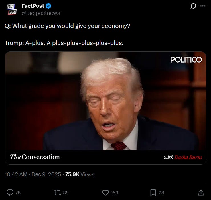 Trump aseguró en una entrevista con Politico que su economía merece una “A+++++”, pese a encuestas que reflejan lo contrario. Su argumento: heredó un desastre y ahora “todo está bajando”. La realidad es más complicada, con el IPC que subió 3% en el último año, los servicios públicos que aumentaron casi 12% y el café que está 20% más caro que en 2024. Lo que pasa es que no lo dejaron terminar: quiso decir “A(umentos)+++++”.