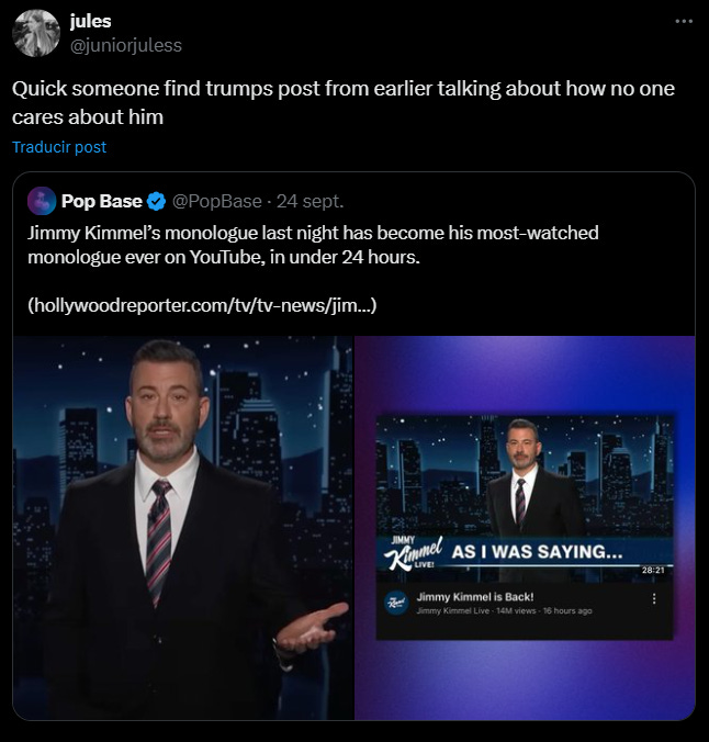 Jimmy Kimmel volvió con un monólogo que ya es el más visto de su carrera: 14 millones de vistas en 15 horas. Defendió la libertad de expresión, habló de unidad y hasta agradeció a críticos conservadores. Ajá, los boicots no lo dejaron hablar por un par de días, pero sí lo convirtieron en rockstar de YouTube.