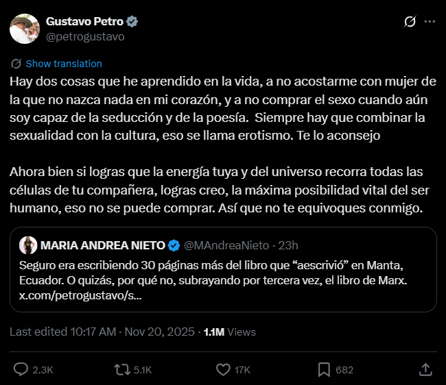 Gustavo Petro en el amor = Gustavo Petro en un club para adultos en Portugal usando recursos públicos. No más comentarios.