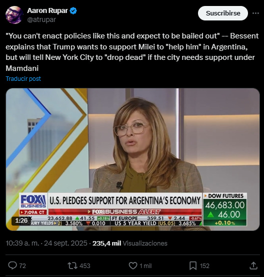 La Casa Blanca evalúa un préstamo de $20,000 millones para apoyar a Javier Milei a estabilizar Argentina. Los granjeros de EEUU protestan, el Tesoro se contradice, y Milei sonríe. Nada de eso importa: nunca nadie se había emocionado tanto por un tweet como el presidente argentino.
