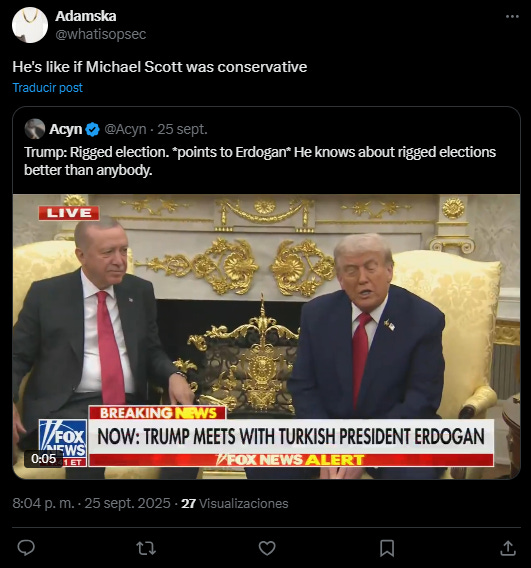 Un presidente que no acepta perder elecciones y otro presidente experto en nunca soltarlas se dan la mano. Trump dice que Erdogan es testarudo, pero “le cae bien”. En el menú: aviones, petróleo y consejos sobre cómo moldear la democracia al gusto del consumidor. Buen provecho.