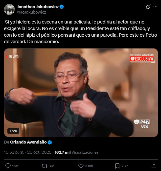 Petro le dice a Trump que en Colombia “no aceptan reyes”, pero Trump le responde llamándolo “rey de la droga”. Si esto fuera ajedrez, ambos estarían jugando damas. Lo cierto es que el presidente de Colombia usa el enfrentamiento para intentar proyectarse como un líder autónomo ante Washington, como si el resto de América Latina lo fuera a considerar así, sobre todo después de entrevistas como la que le dio a Univisión.