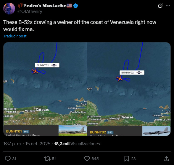 El paso de los B-52 por el Caribe envía un mensaje claro: presión militar como lenguaje político. Pero si ves la trayectoria del vuelo, el mensaje es igual de claro y no tiene nada que ver con lo político. Digamos que fue casualidad.