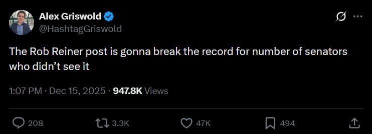 El presidente Trump pudo optar por guardar silencio sobre el asesinato de Rob Reiner y su esposa, pero terminó burlándose con un tonito odioso en Truth Social que no merece ni link aquí: “Falleció, junto con su esposa, Michele, según se informa debido a la ira que causó a otros a través de su aflicción masiva, inquebrantable e incurable con una enfermedad paralizante de la mente conocida como SÍNDROME DE TRASTORNO DE TRUMP”.