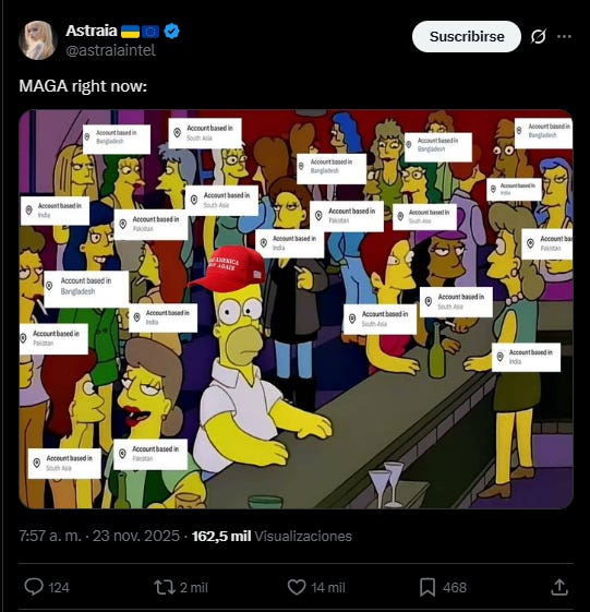 Resulta que muchos de los que van hasta la muerte con el America First ahora están tuiteando desde Nigeria, Rusia y hasta Tailandia. Una sorpresa para nadie excepto, aparentemente, para ellos mismos. La nueva herramienta de transparencia de X dejó claro que el MAGA digital es tan estadounidense como un call center internacional.